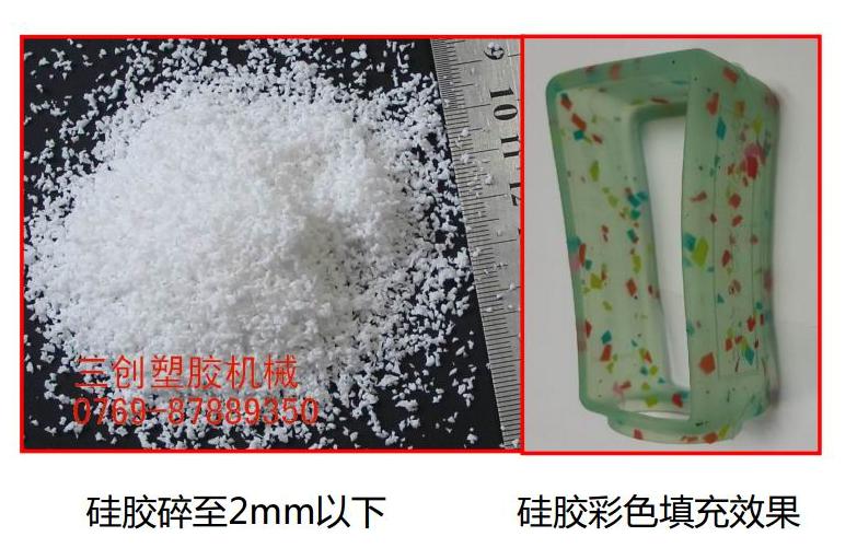 硅膠粉碎機(jī):可粉碎硅膠最小至2mm以下,使無(wú)法回爐再利用的硅膠材料,經(jīng)粉碎后可再次用于模具制作,或用于花色添加。